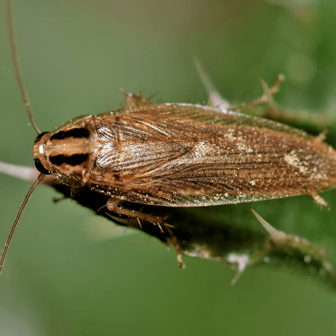German cockroaches are small, light brown insects with two dark stripes running down their backs. They thrive in warm, humid environments and are often found in kitchens and bathrooms.